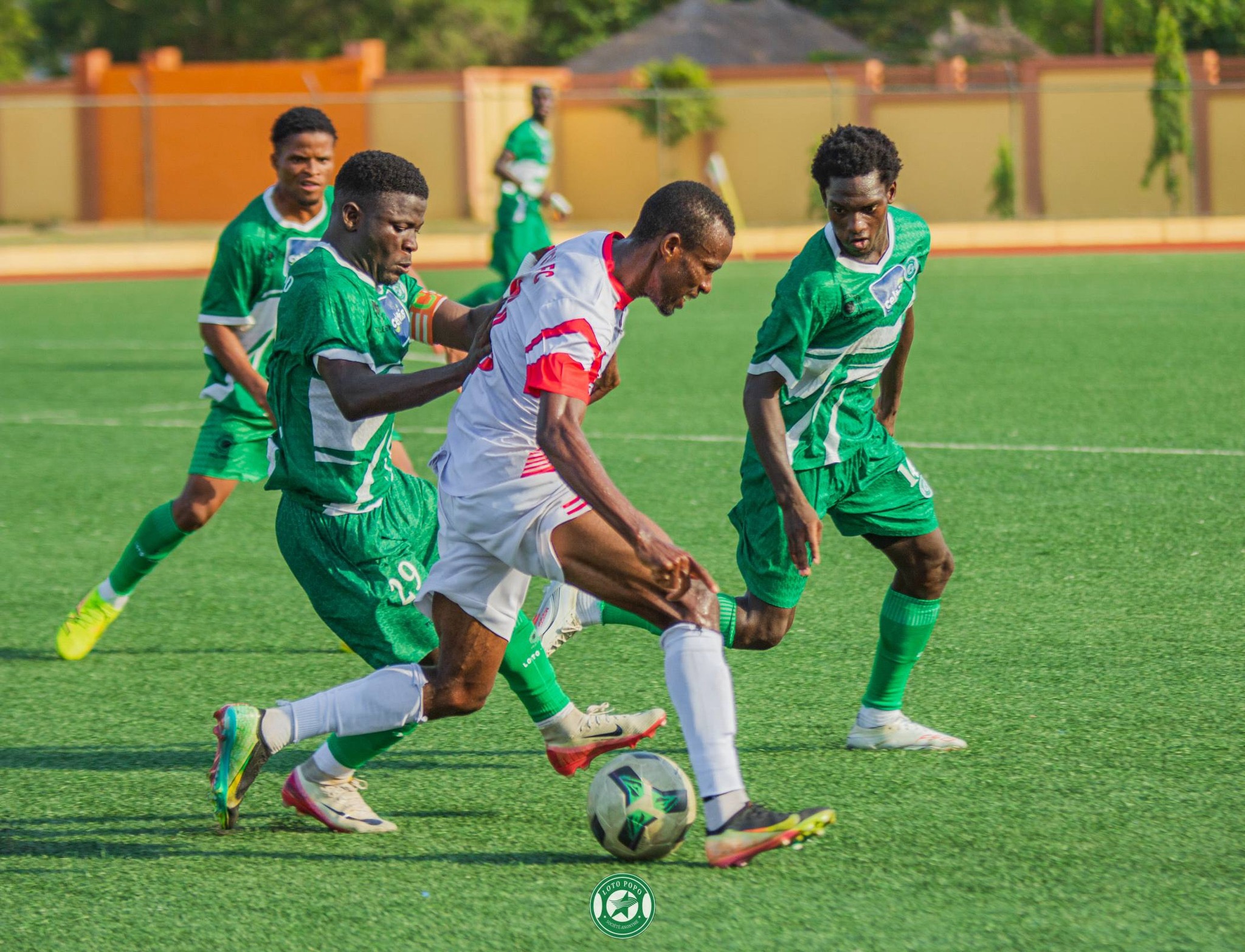 Dès l’entame de la rencontre, Zoulkanéni SEIBOU et ses coéquipiers prennent le contrôle du ballon et mettent la pression sur la défense adverse. Bien organisés, les cotonculteurs ferment rapidement les espaces, rendant les offensives locales peu dangereuses. Le milieu de terrain devient alors le théâtre d’une rude bataille, marquée notamment par les duels HOUNKANRIN Gildas – Mohamed BOLADJI et Rodrigue FASSINOU – Kader KONE.