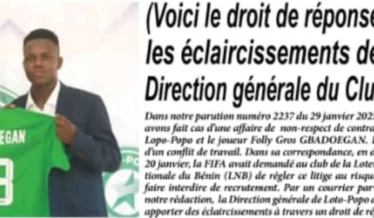Il semble que votre article, intitulé "TRICHERIES ET MANŒUVRES FRAUDULEUSES DES CLUBS ENGAGÉS DANS LE CHAMPIONNAT NATIONAL", signé par M. Nazaire César VIKOU, ait suscité un certain enthousiasme au sein de votre rédaction, notamment pour répandre des informations jugées "précises" et "exactes". Nous avons pris connaissance des propos tenus à l'encontre de Loto-Popo FC et, avant de nous laisser emporter par l’émotion, nous avons pris un moment pour clarifier quelques petits détails.