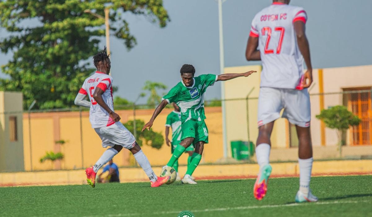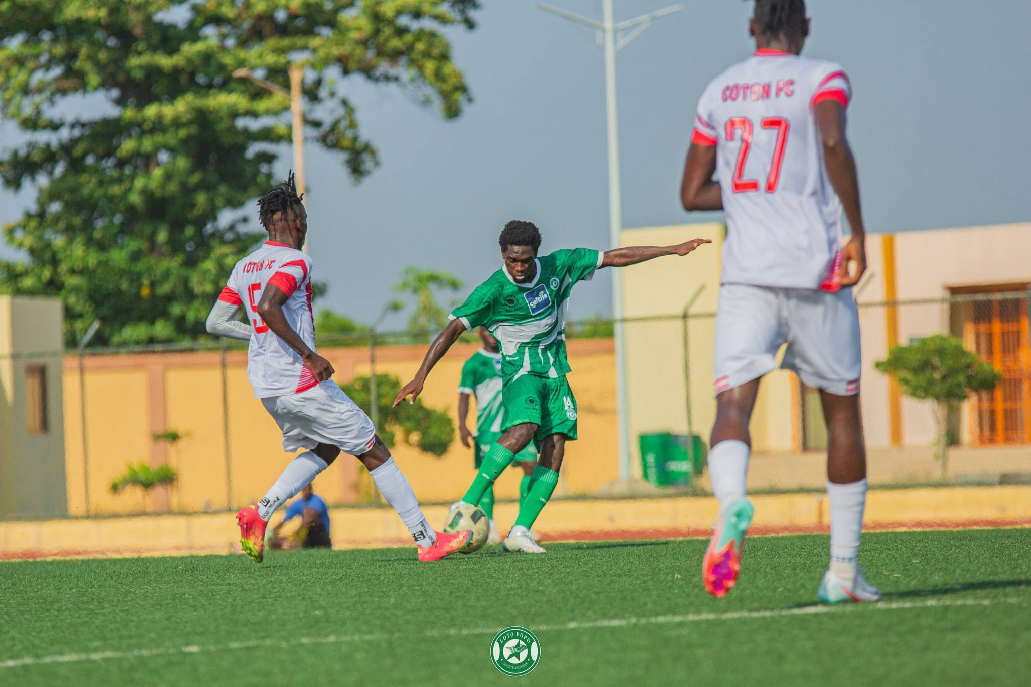 Dès l’entame de la rencontre, Zoulkanéni SEIBOU et ses coéquipiers prennent le contrôle du ballon et mettent la pression sur la défense adverse. Bien organisés, les cotonculteurs ferment rapidement les espaces, rendant les offensives locales peu dangereuses. Le milieu de terrain devient alors le théâtre d’une rude bataille, marquée notamment par les duels HOUNKANRIN Gildas – Mohamed BOLADJI et Rodrigue FASSINOU – Kader KONE.