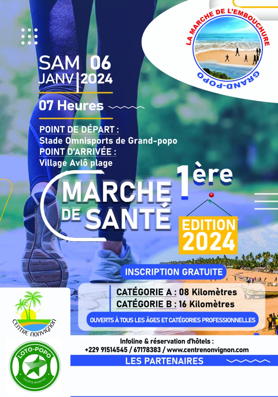 Nul n'ignore les bienfaits et l'importance du sport de surcroît le sport d'entretien dans la vie de l'Homme. Ainsi, soucieux de la bonne santé de la population de Grand-Popo, le Centre Nonvignon en partenariat avec Loto-Popo organise la 1ère édition de la marche de santé le samedi 06 janvier 2024 à 07h précise.